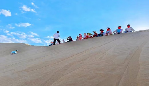 모래 썰매 체험: 인컨타라 사막의 모래 언덕에서 즐기는 아찔한 모래 썰매 체험! 계단으로 언덕을 올라가서 썰매를 타고 내려오며 보다 편리하고 스릴 넘치게 즐길 수 있습니다.